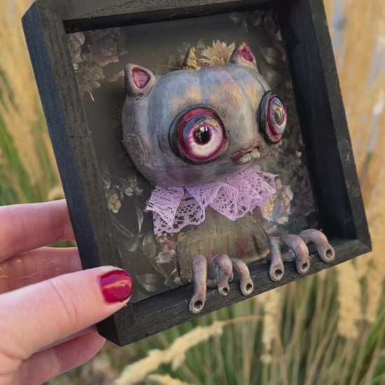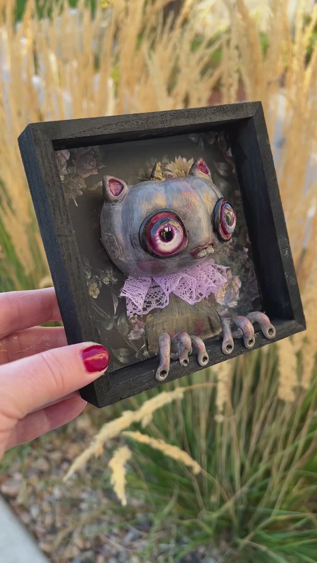 This one-of-a-kind framed Pumpkin blends creepy and cute into a hand-sculpted delight. Sized just right—compare it to my hand for scale—it's perfectly hangable to add a quirky charm to any space. A playful twist on autumn decor that surprises and delights!