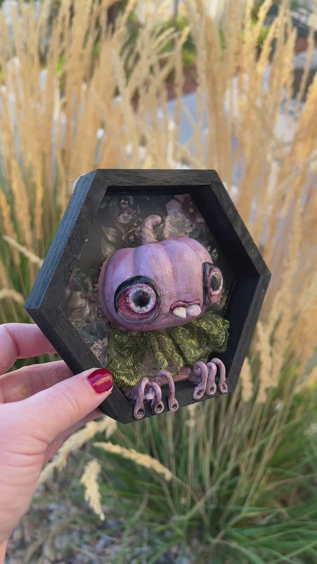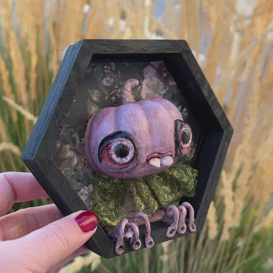This one-of-a-kind framed Pumpkin blends creepy and cute into a hand-sculpted delight. Sized just right—compare it to my hand for scale—it's perfectly hangable to add a quirky charm to any space. A playful twist on autumn decor that surprises and delights!