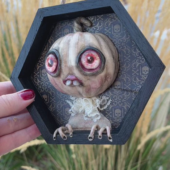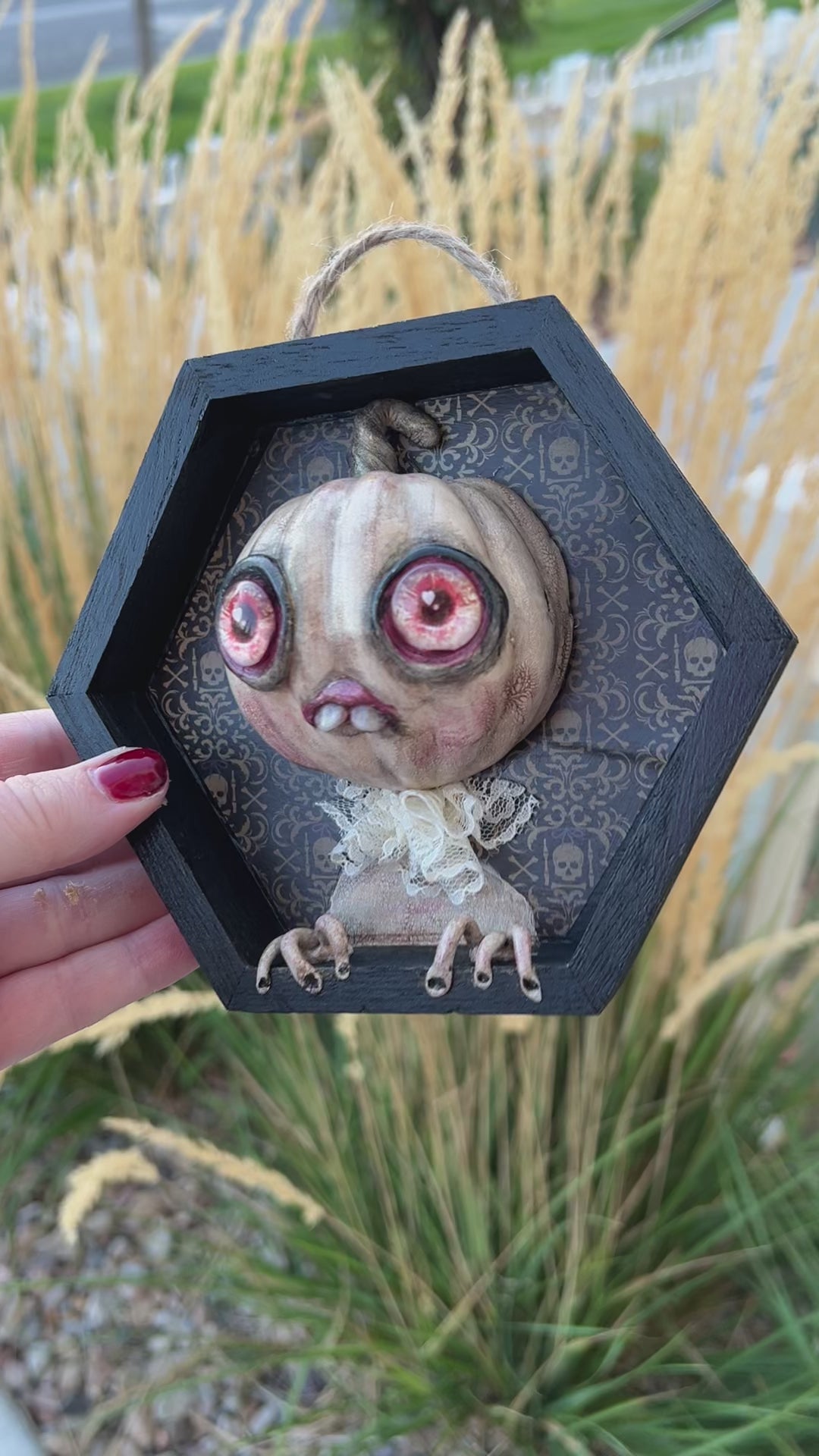 This one-of-a-kind framed Pumpkin blends creepy and cute into a hand-sculpted delight. Sized just right—compare it to my hand for scale—it's perfectly hangable to add a quirky charm to any space. A playful twist on autumn decor that surprises and delights!