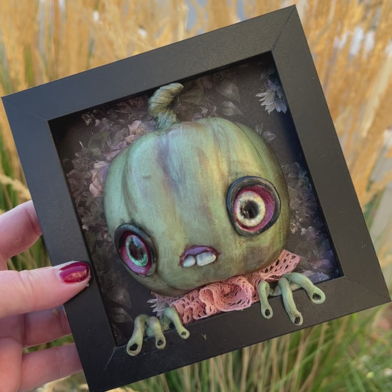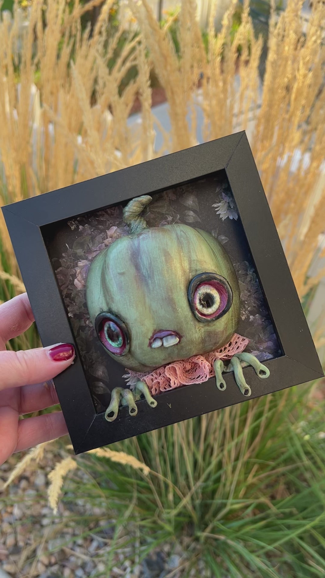 This one-of-a-kind framed Pumpkin blends creepy and cute into a hand-sculpted delight. Sized just right—compare it to my hand for scale—it's perfectly hangable to add a quirky charm to any space. A playful twist on autumn decor that surprises and delights!
