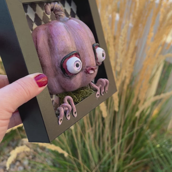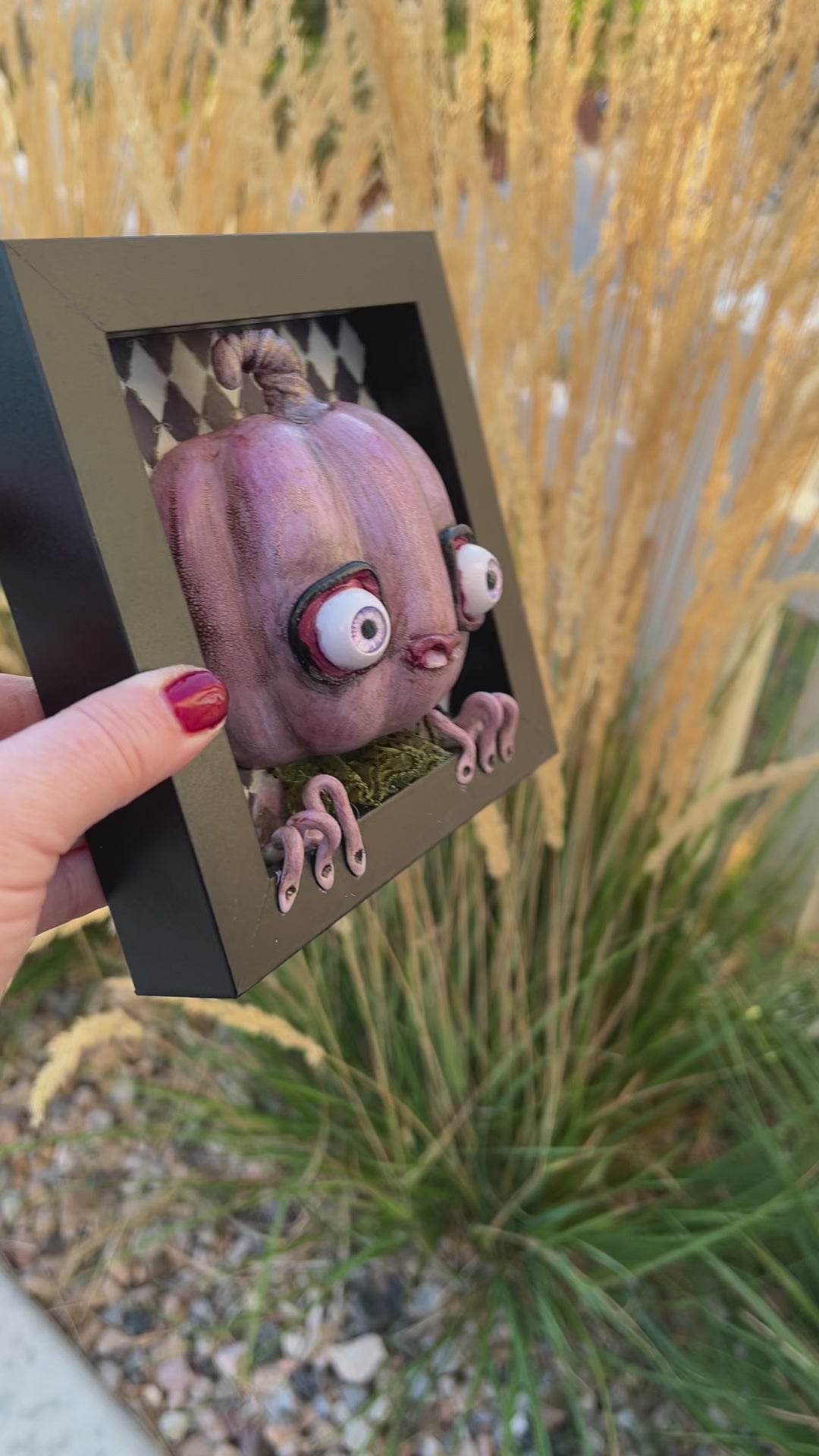 This one-of-a-kind framed Pumpkin blends creepy and cute into a hand-sculpted delight. Sized just right—compare it to my hand for scale—it's perfectly hangable to add a quirky charm to any space. A playful twist on autumn decor that surprises and delights!