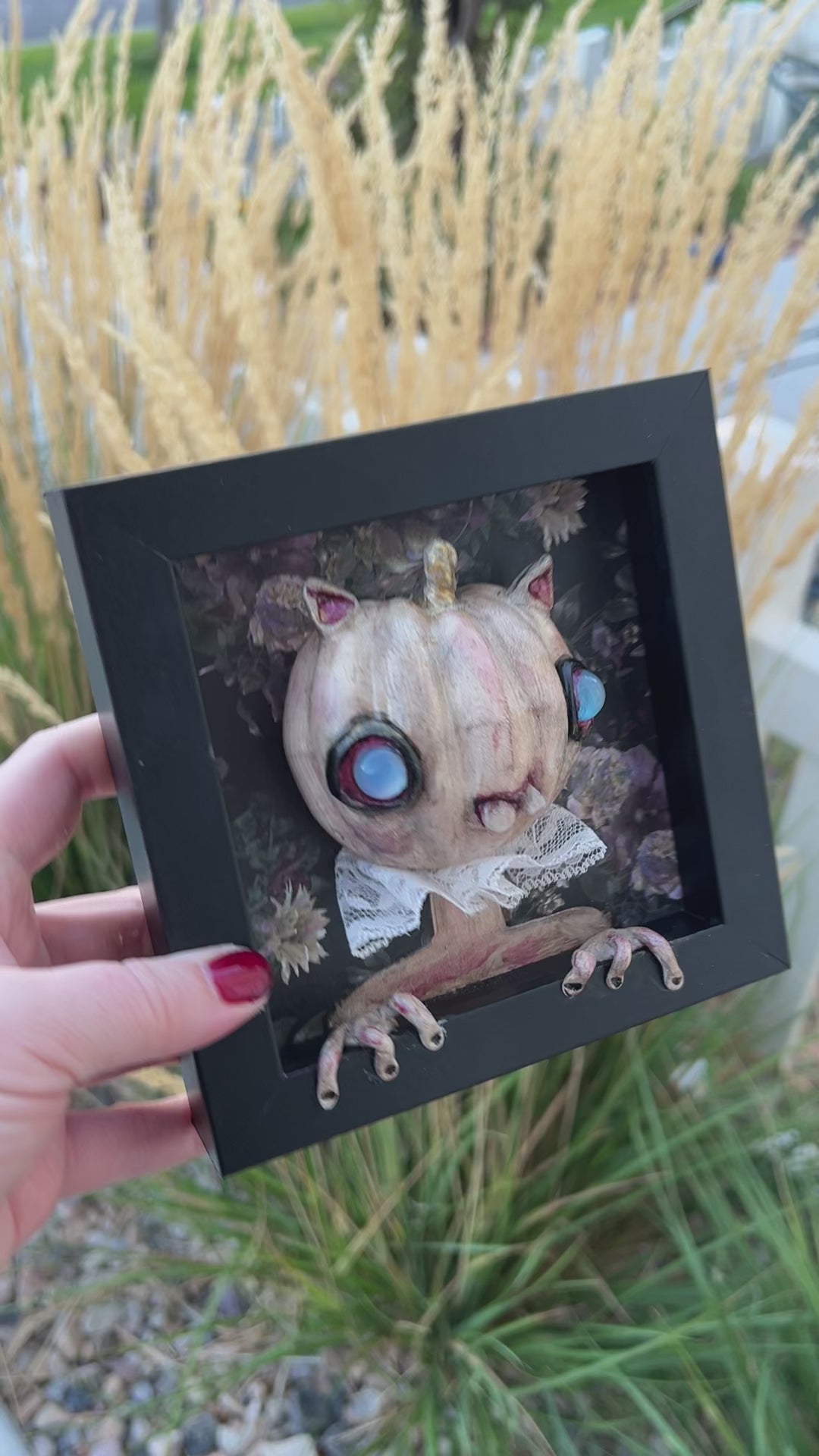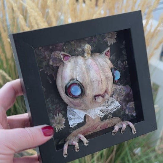 This one-of-a-kind framed Pumpkin blends creepy and cute into a hand-sculpted delight. Sized just right—compare it to my hand for scale—it's perfectly hangable to add a quirky charm to any space. A playful twist on autumn decor that surprises and delights!