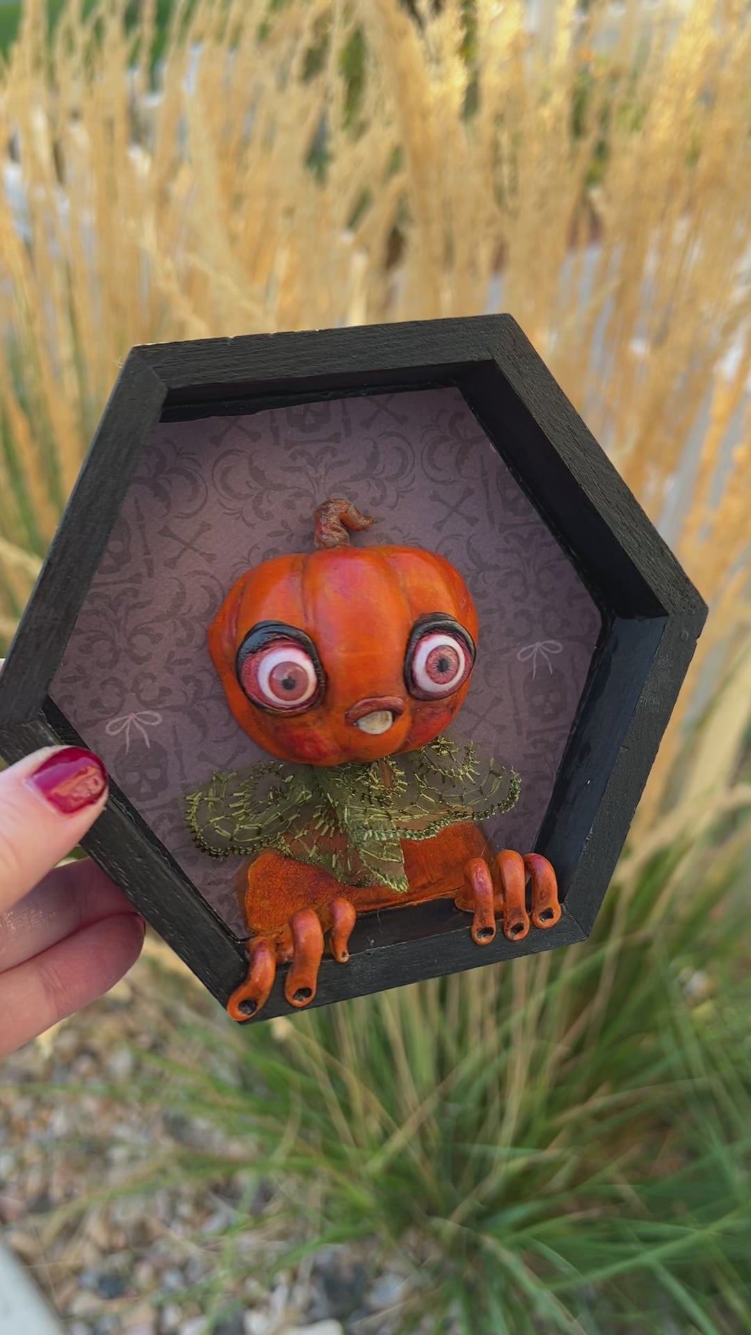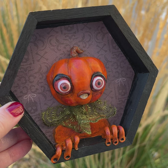 This one-of-a-kind framed Pumpkin blends creepy and cute into a hand-sculpted delight. Sized just right—compare it to my hand for scale—it's perfectly hangable to add a quirky charm to any space. A playful twist on autumn decor that surprises and delights!