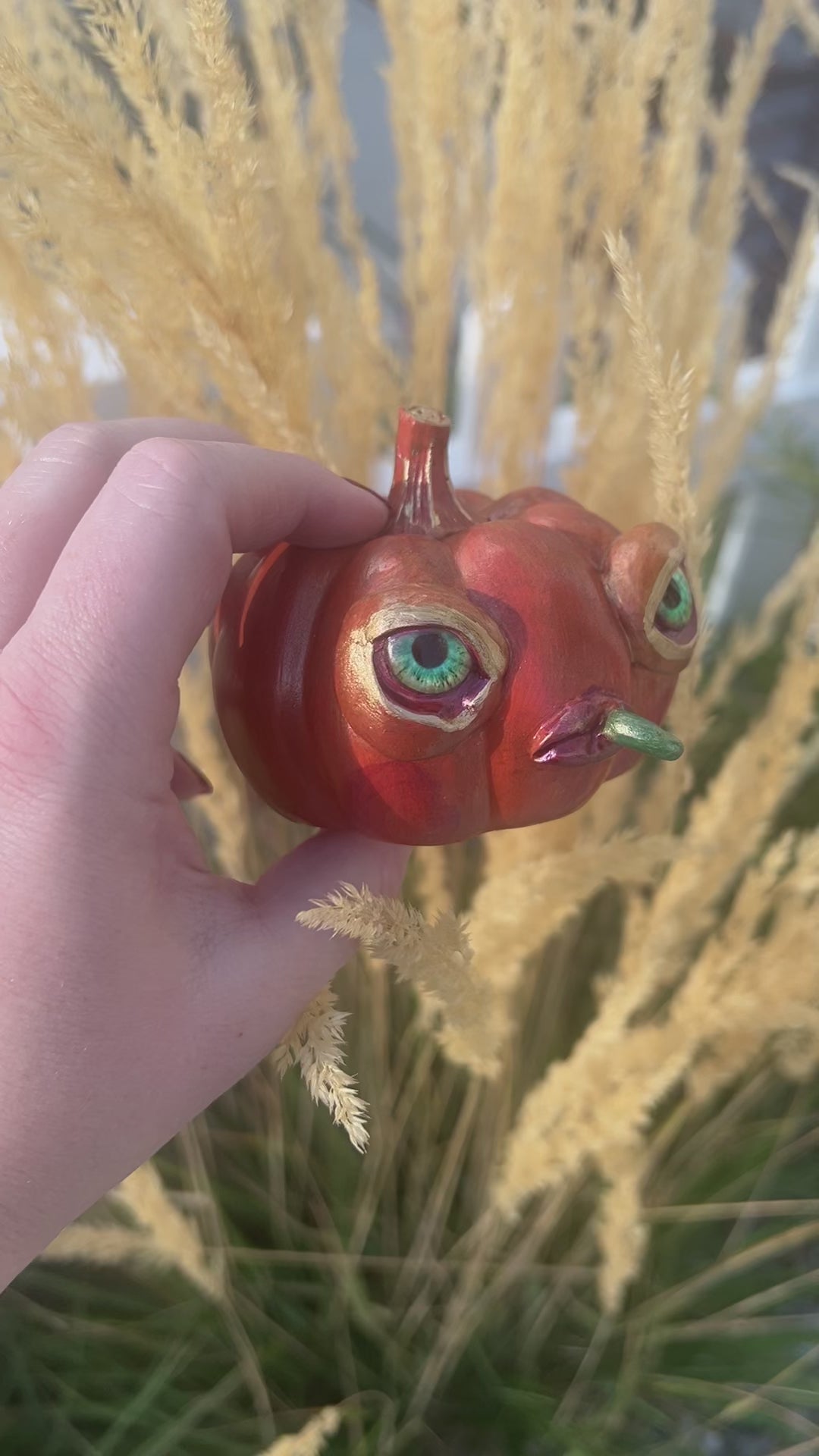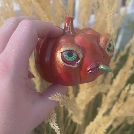 This charming hand-sculpted and hand-painted resin pumpkin, measuring about 3 1/2 inches, is the perfect playful touch to your Halloween decor. Its adorable design adds a whimsical flair, making your home feel festive and fun for the spooky season.