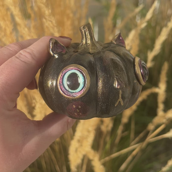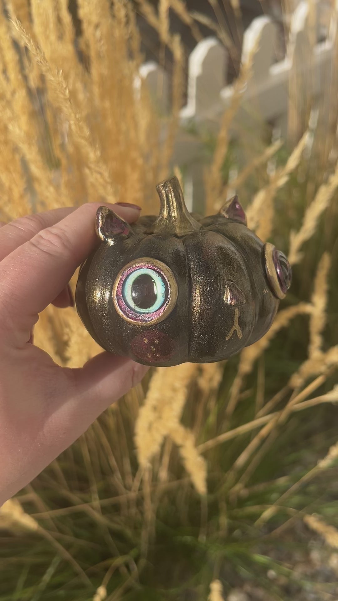This charming hand-sculpted and hand-painted resin pumpkin, measuring about 3 1/2 inches, is the perfect playful touch to your Halloween decor. Its adorable design adds a whimsical flair, making your home feel festive and fun for the spooky season.