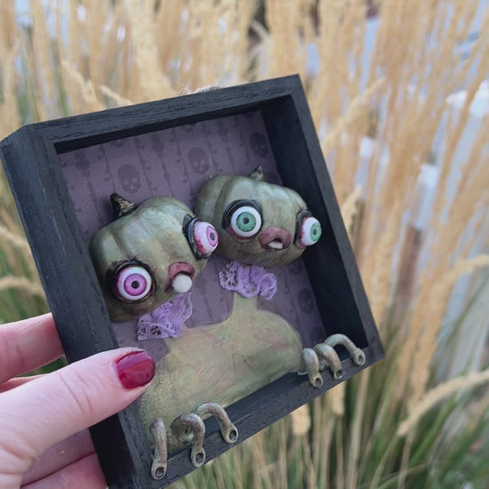 This one-of-a-kind framed Pumpkin blends creepy and cute into a hand-sculpted delight. Sized just right—compare it to my hand for scale—it's perfectly hangable to add a quirky charm to any space. A playful twist on autumn decor that surprises and delights!