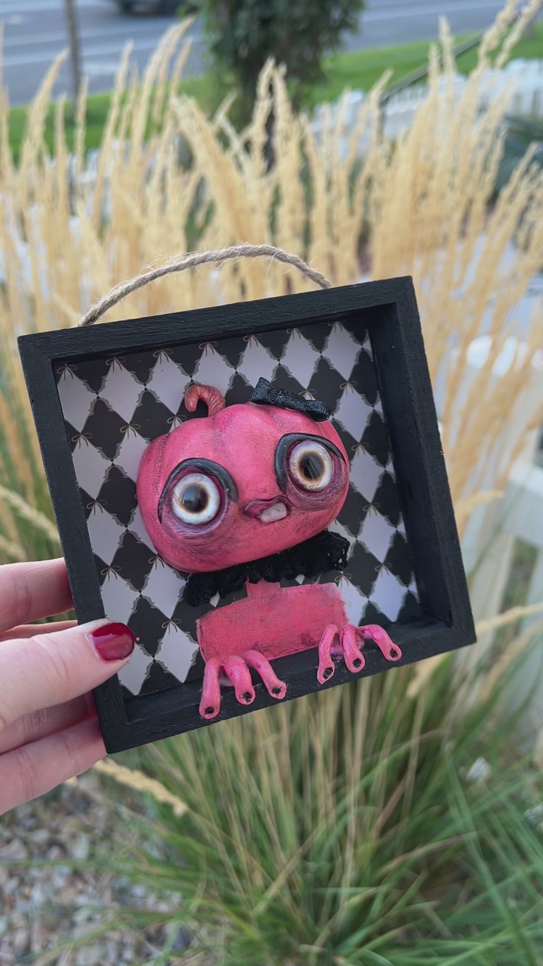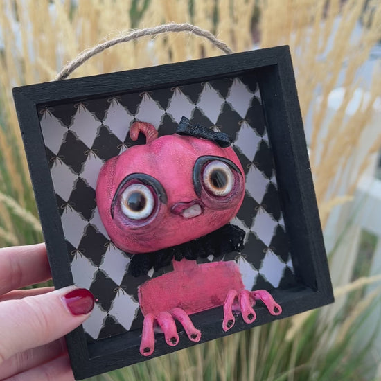 This one-of-a-kind framed Pumpkin blends creepy and cute into a hand-sculpted delight. Sized just right—compare it to my hand for scale—it's perfectly hangable to add a quirky charm to any space. A playful twist on autumn decor that surprises and delights!