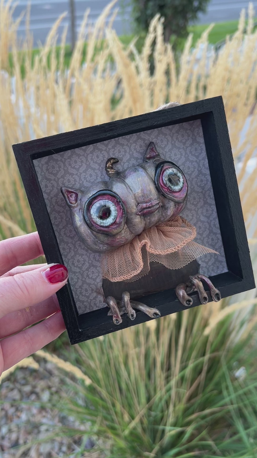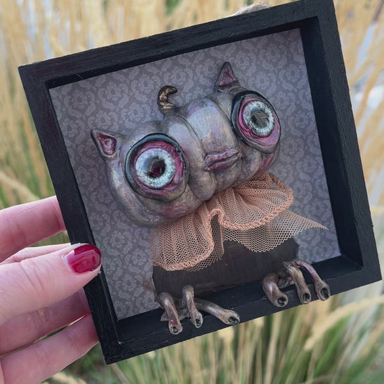 This one-of-a-kind framed Pumpkin blends creepy and cute into a hand-sculpted delight. Sized just right—compare it to my hand for scale—it's perfectly hangable to add a quirky charm to any space. A playful twist on autumn decor that surprises and delights!