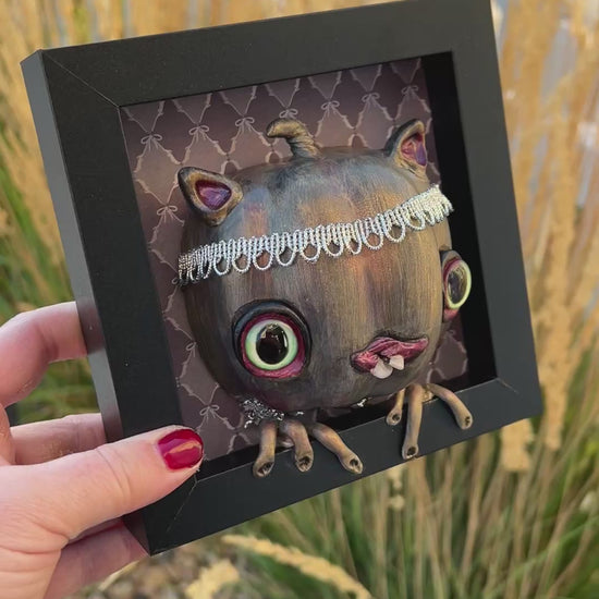 This one-of-a-kind framed Pumpkin blends creepy and cute into a hand-sculpted delight. Sized just right—compare it to my hand for scale—it's perfectly hangable to add a quirky charm to any space. A playful twist on autumn decor that surprises and delights!